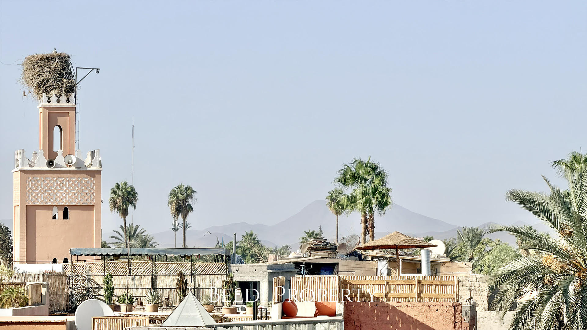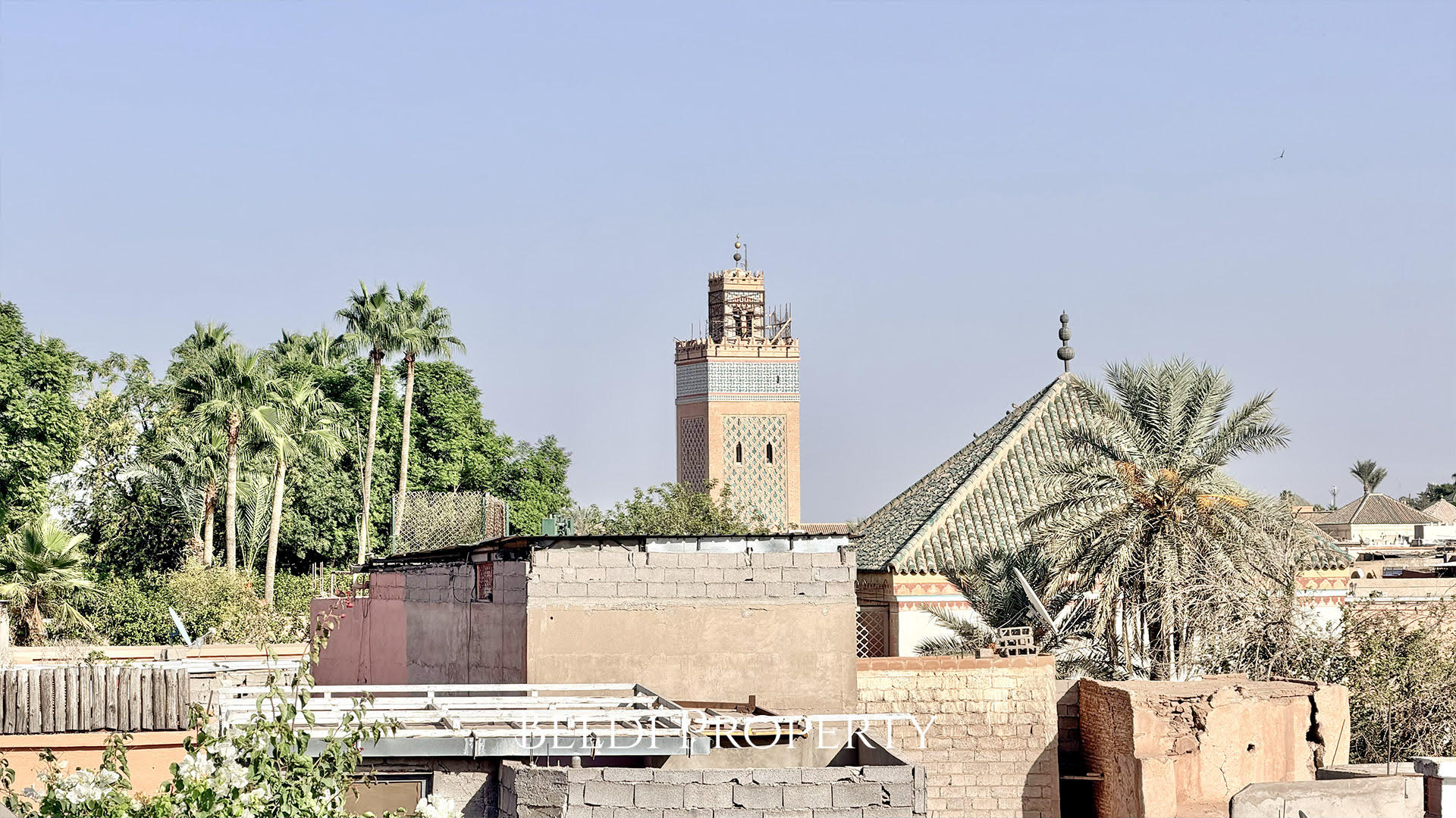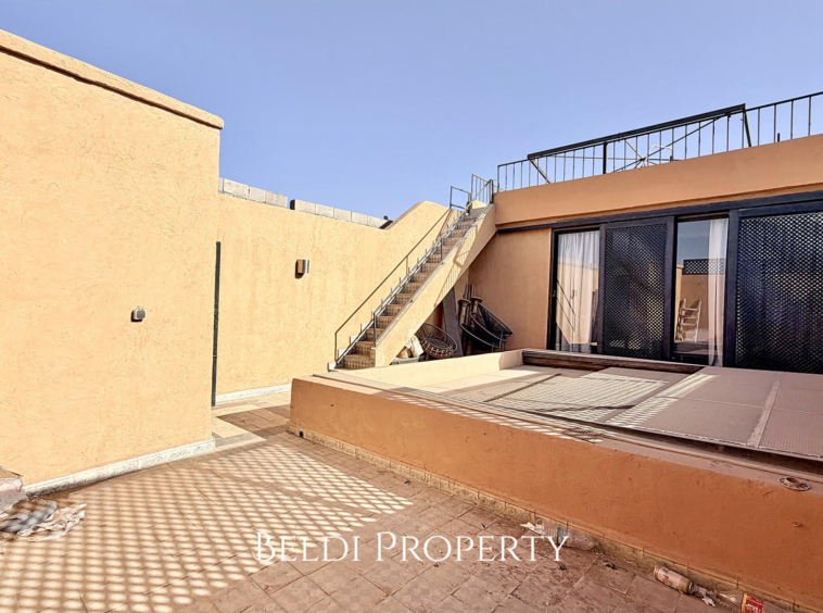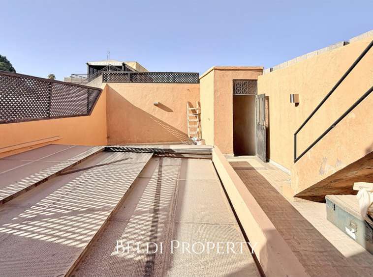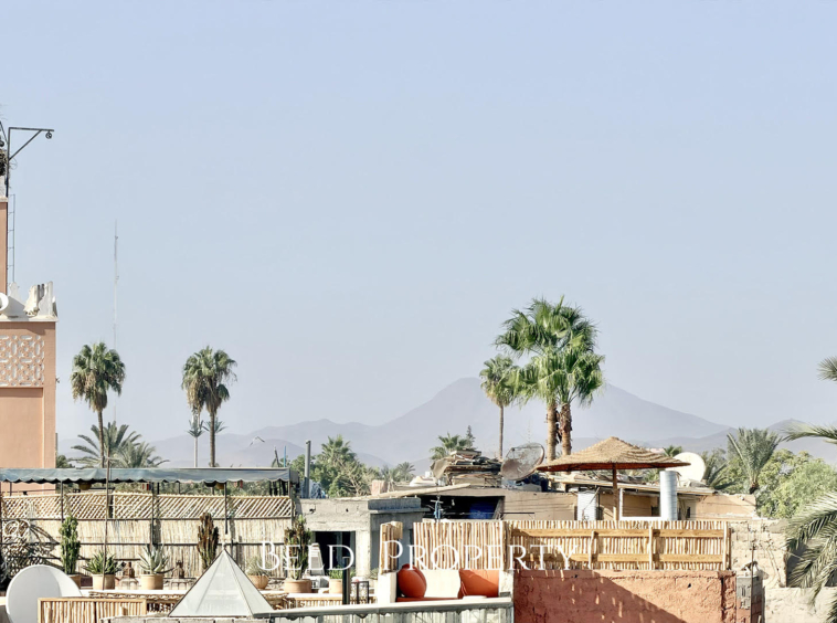 La terrasse sur deux niveaux offre une vue panoramique sur la Koutoubia, la Kasbah, les toits de la Médina et la végétation environnante. Un espace parfait pour se détendre ou recevoir dans un cadre authentique.