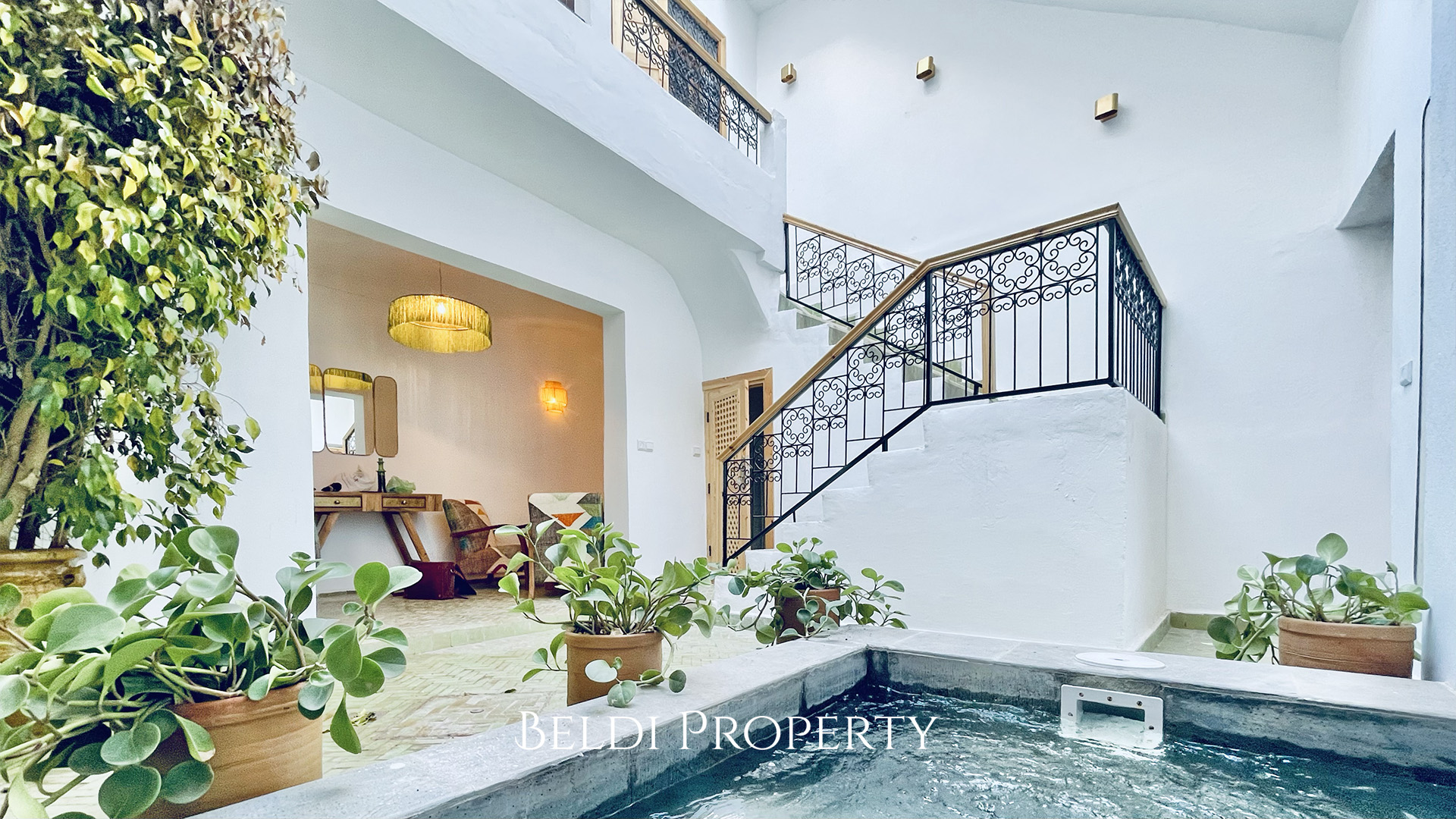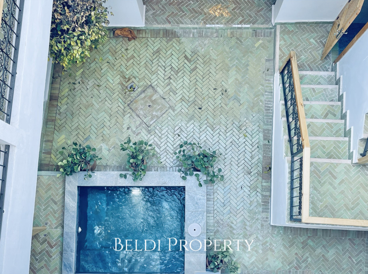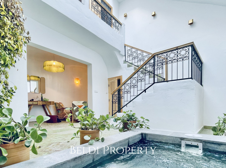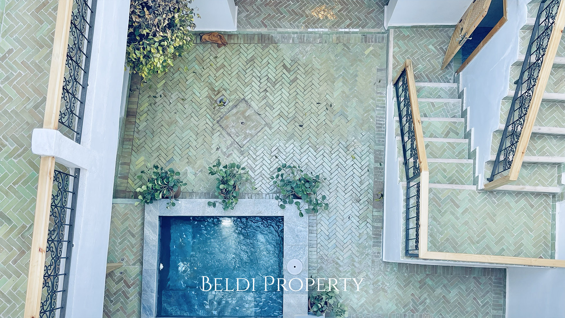 À vendre – Dar SKY STYLE : authentique dar avec patio, bassin et rooftop vue Koutoubia et mosquée Ben Youssef