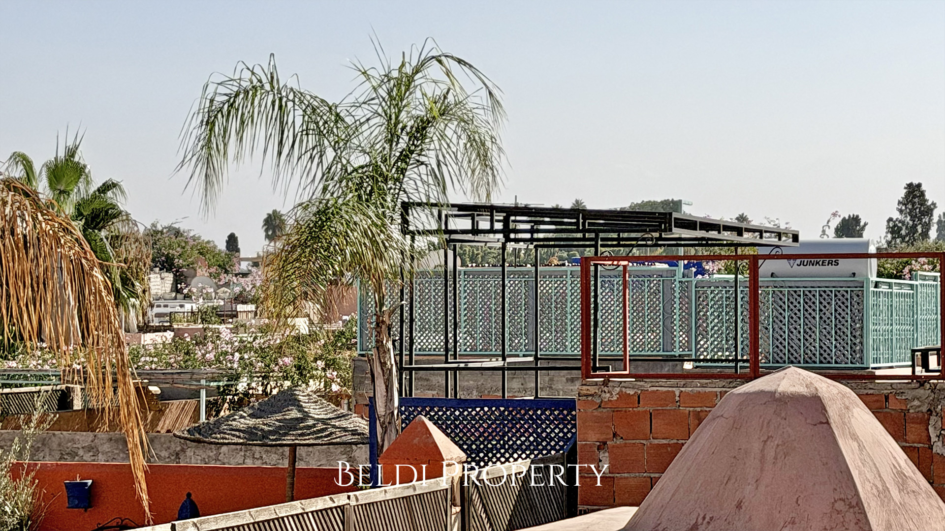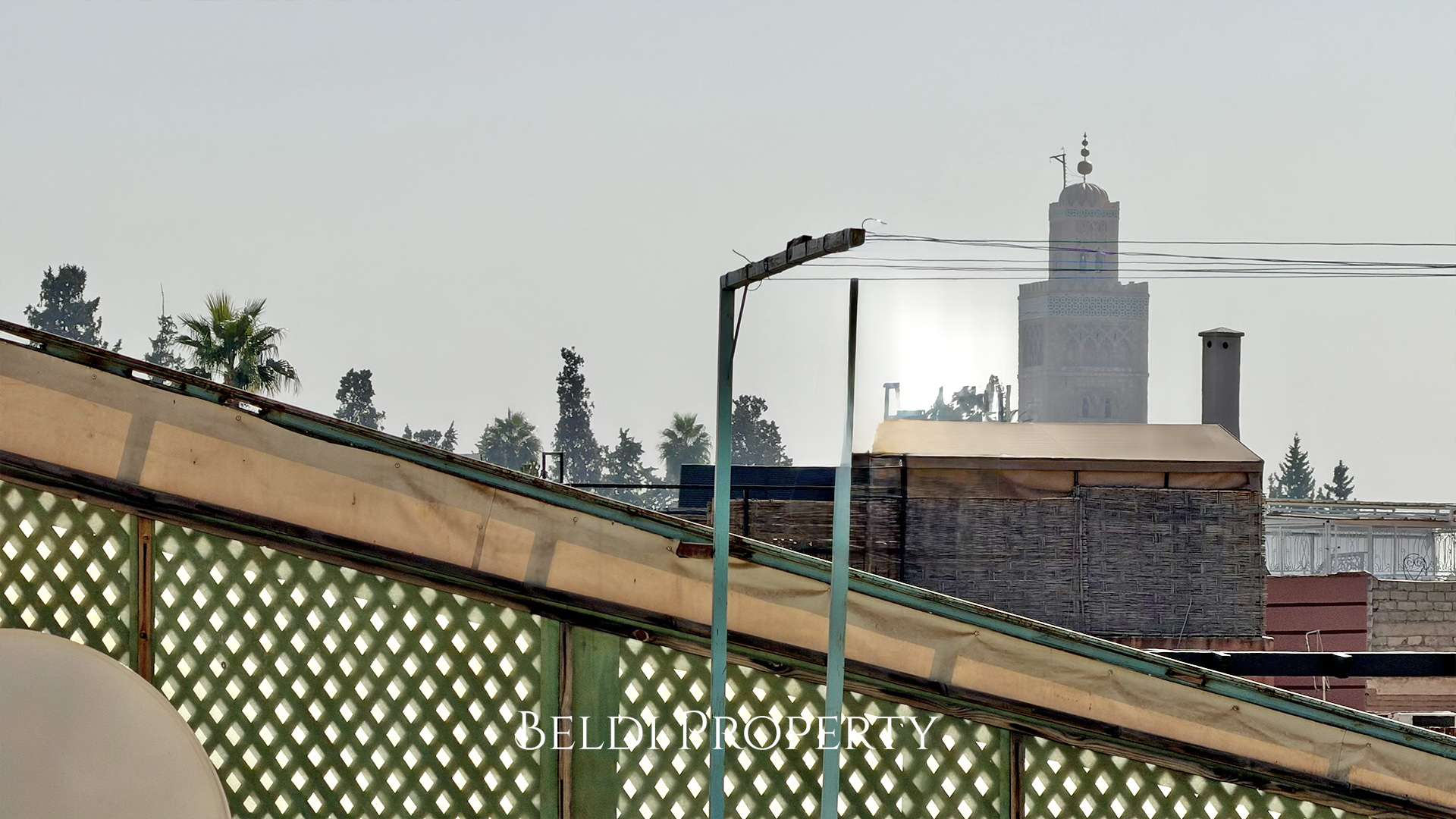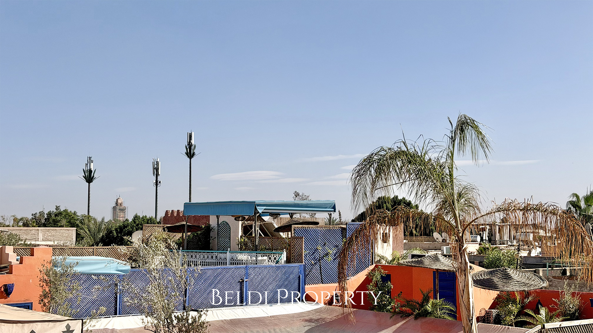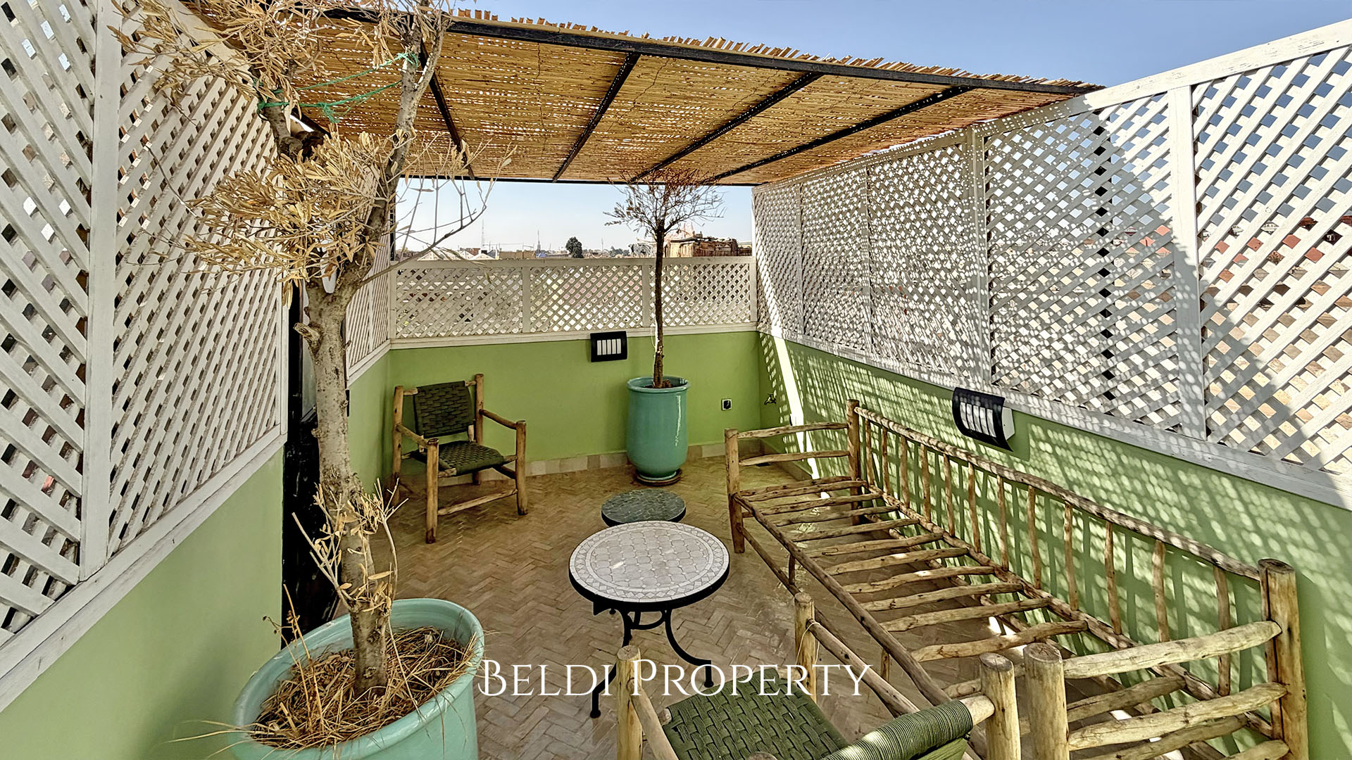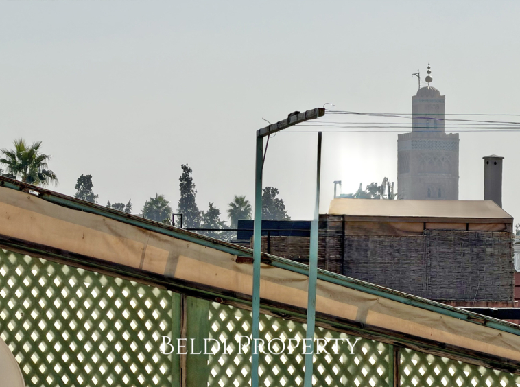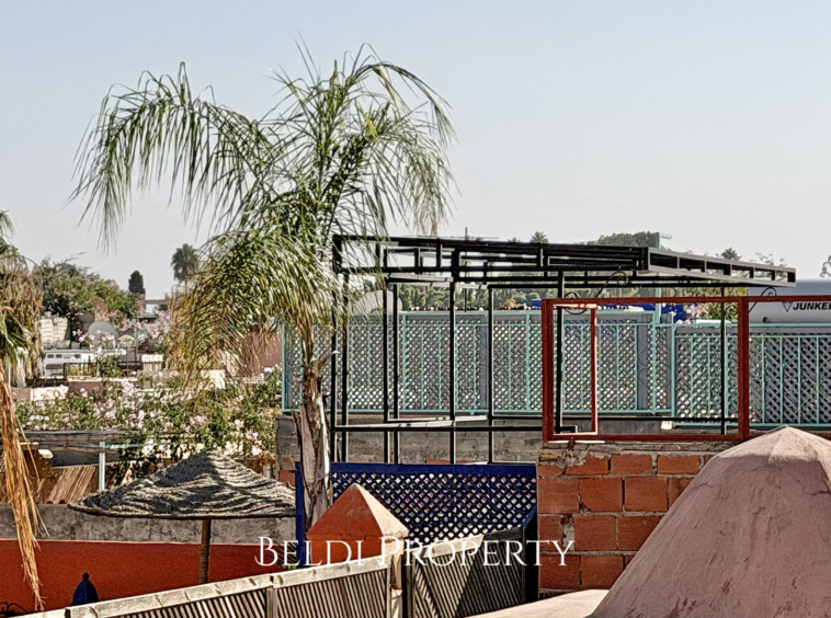 Le dernier niveau propose une terrasse couverte offrant une belle vue dégagée sur la Médina, idéale pour profiter des soirées à Marrakech.