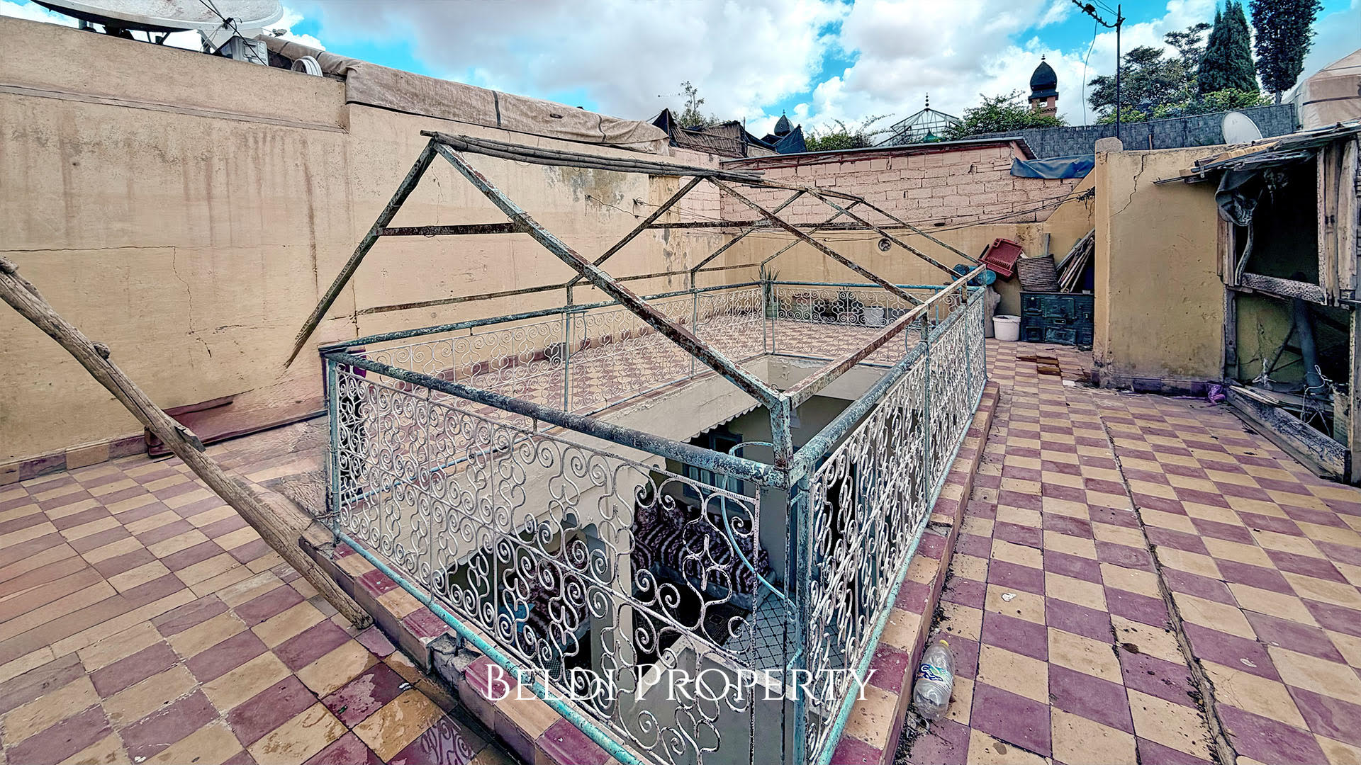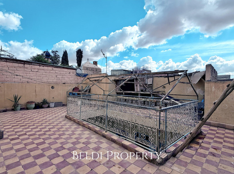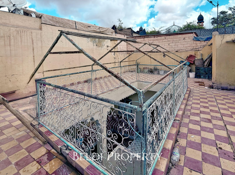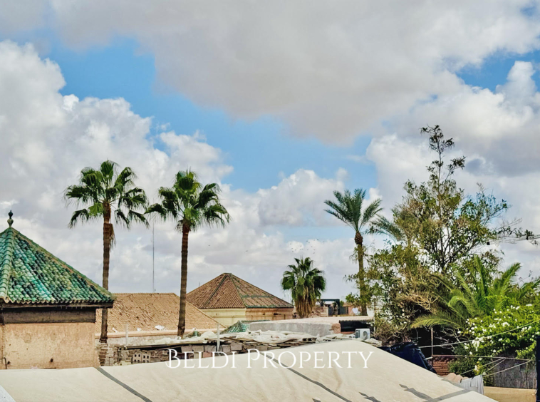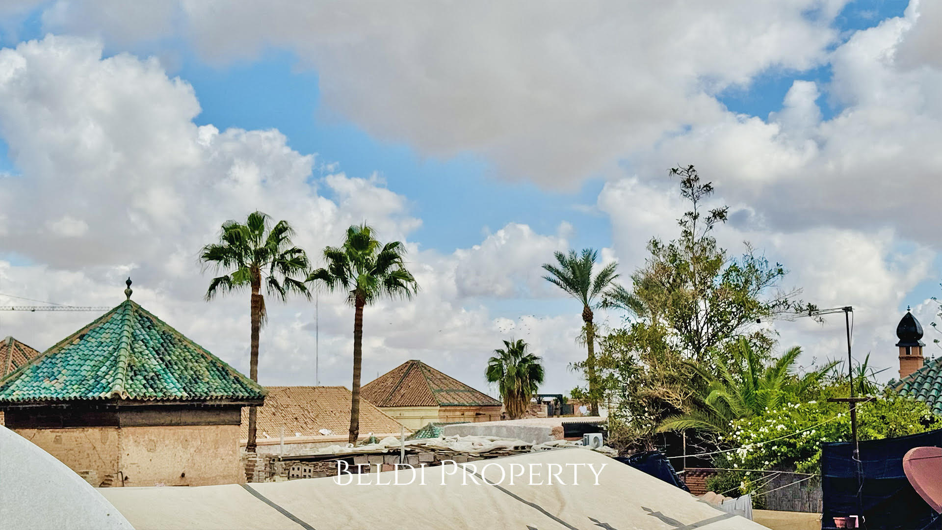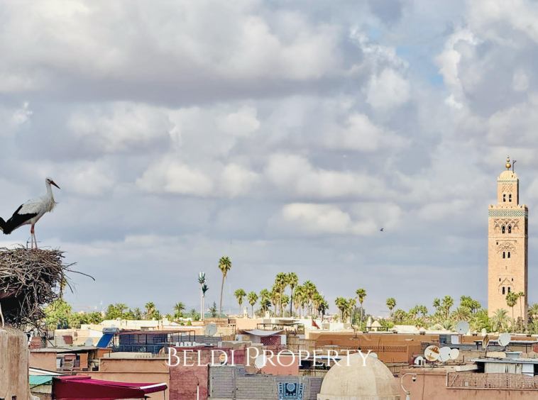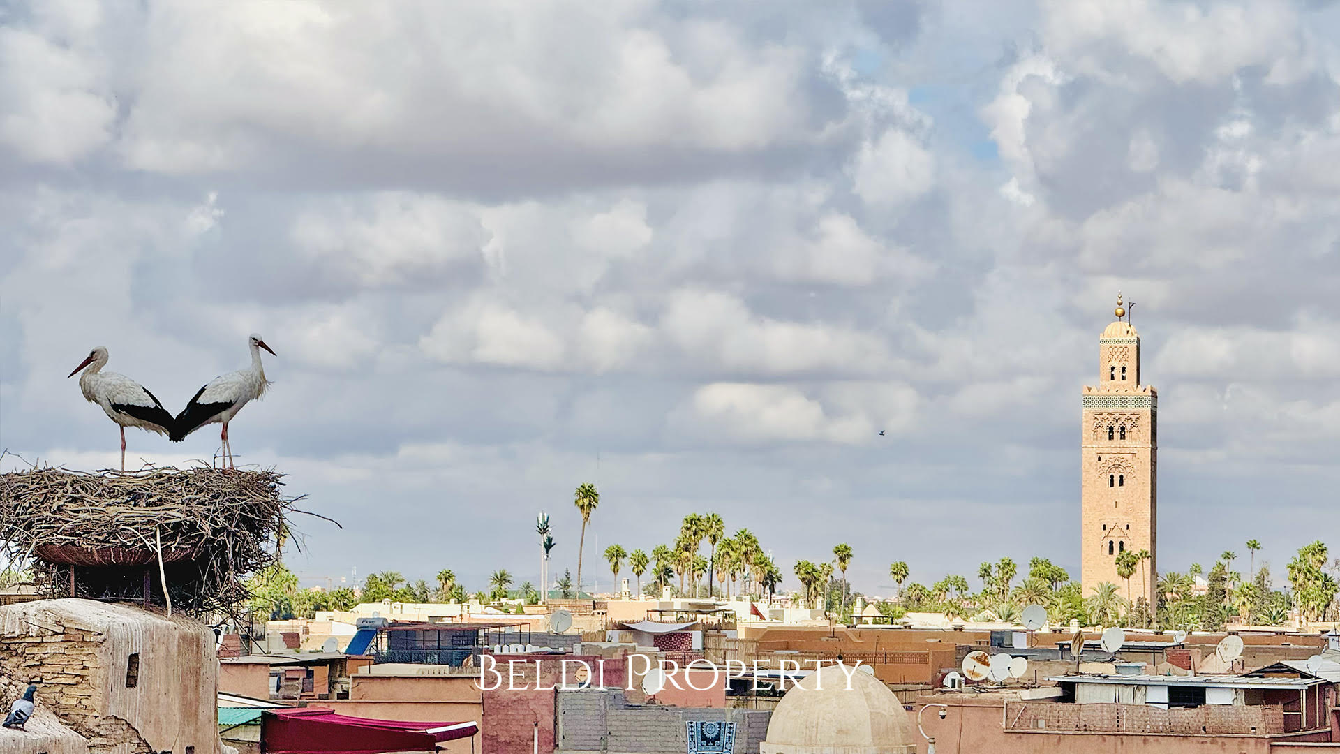 Le rooftop de la maison accueille des dépendances d’environ 30 m², offrant une terrasse avec vue panoramique sur la Koutoubia, la mosquée de la Kasbah, la place de la Kasbah et un authentique nid de cigognes. Ce cadre unique est idéal pour un projet de maison de luxe, riad ou maison d’hôtes dans la Médina.