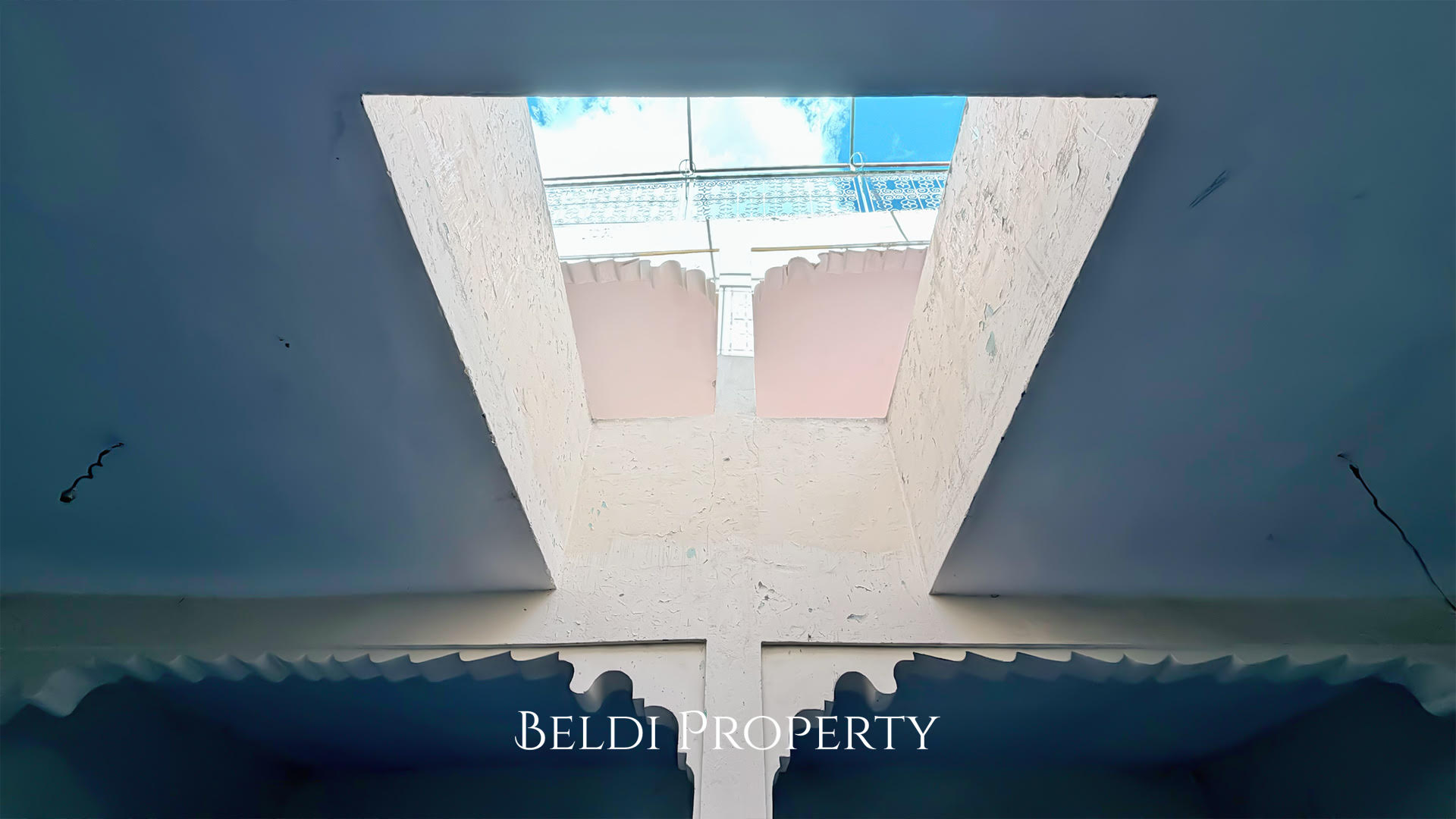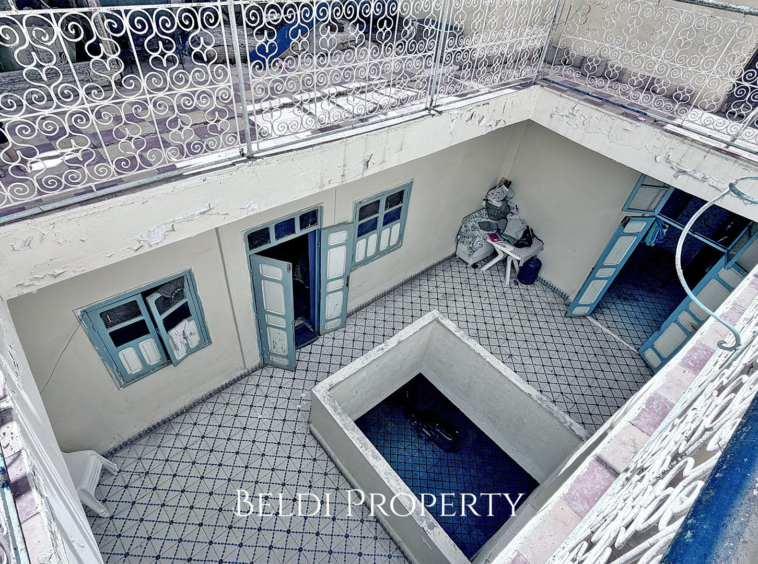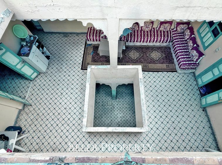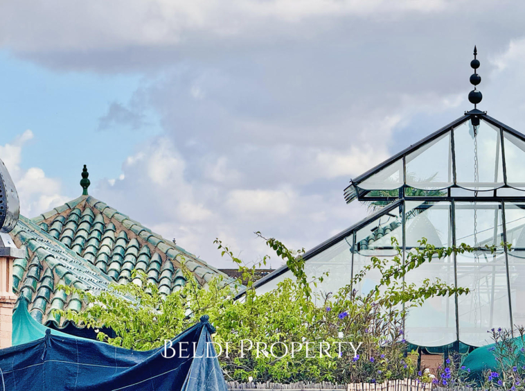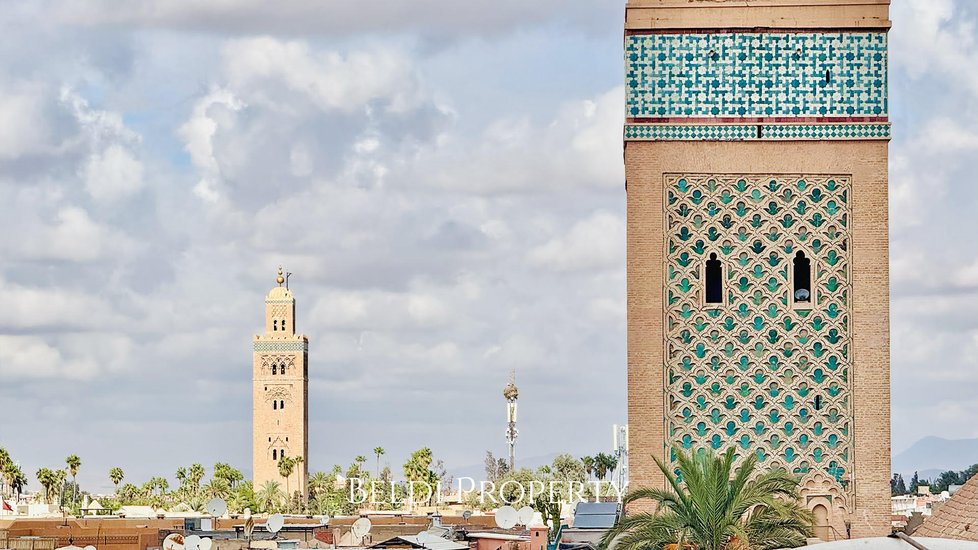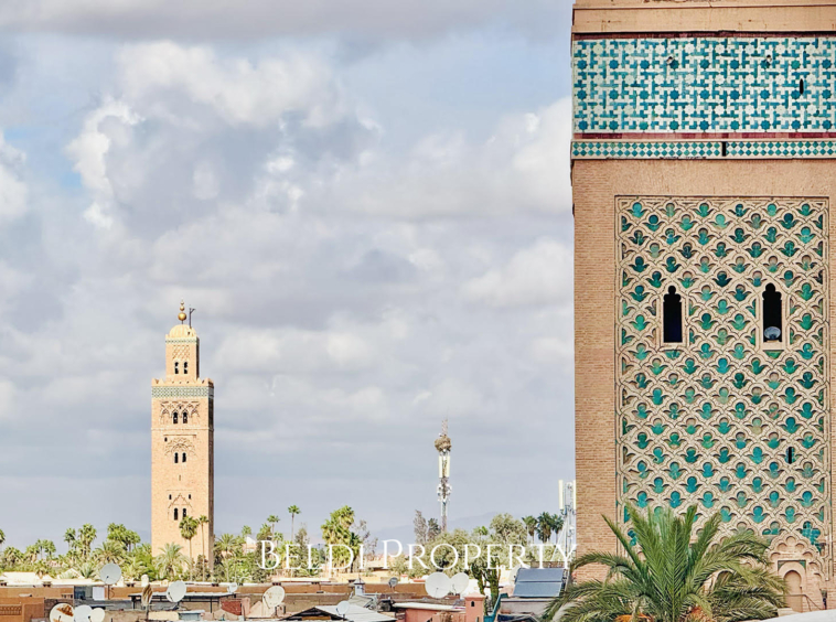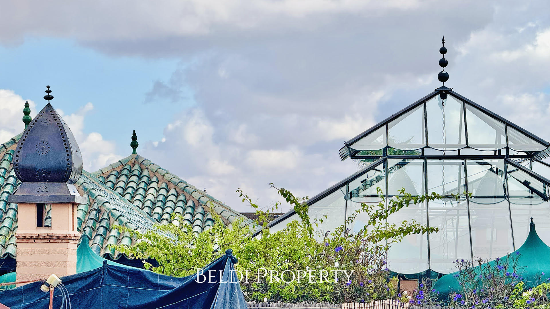 Le rooftop de la maison accueille des dépendances d’environ 30 m², offrant une terrasse avec vue panoramique sur la Koutoubia, la mosquée de la Kasbah, la place de la Kasbah et un authentique nid de cigognes. Ce cadre unique est idéal pour un projet de maison de luxe, riad ou maison d’hôtes dans la Médina.