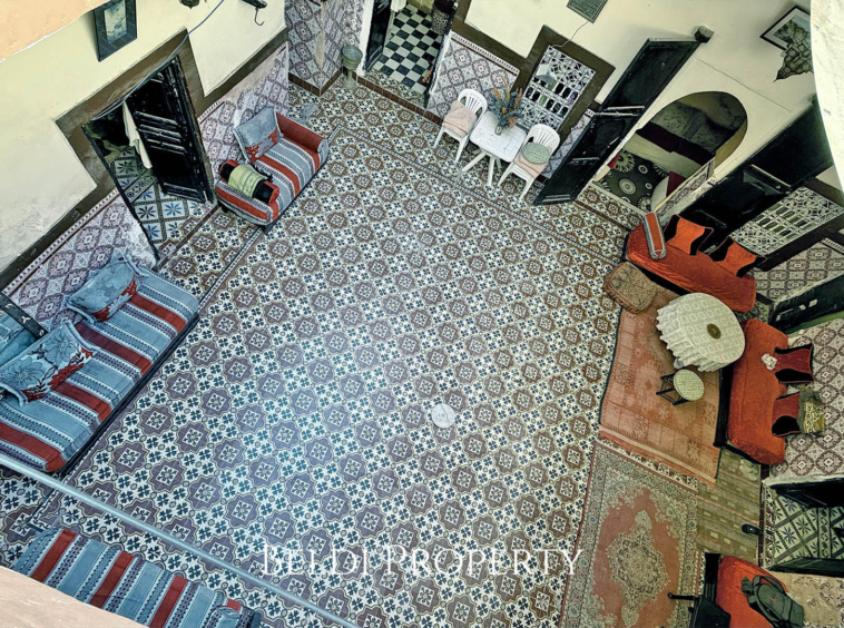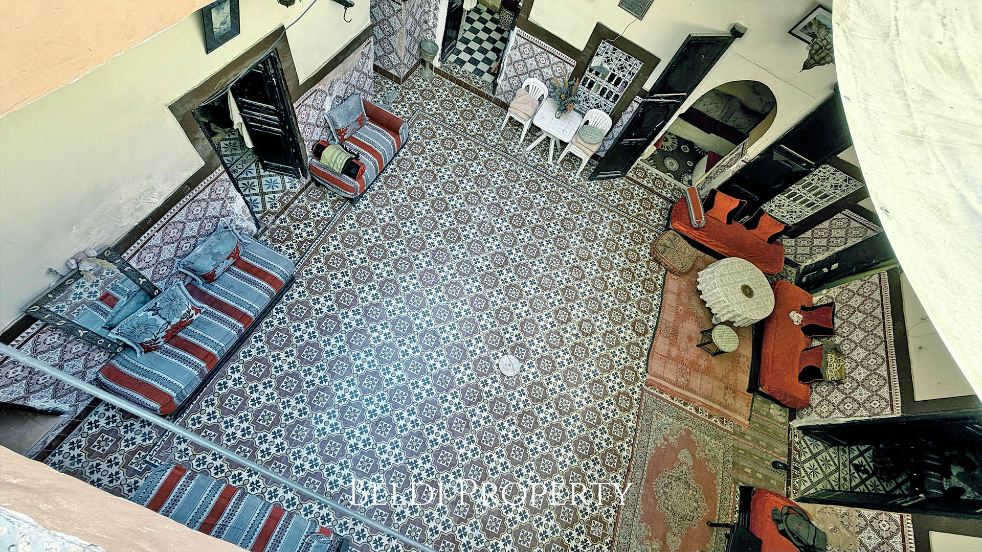 Le riad bénéficie d’une superficie de 220 m² au sol, répartie autour d’un patio central. Il dispose de deux entrées indépendantes ainsi que de deux escaliers séparés, correspondant au cahier des charges 2025 pour l’obtention du classement maison d’hôtes