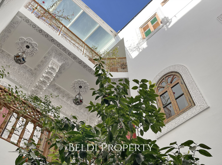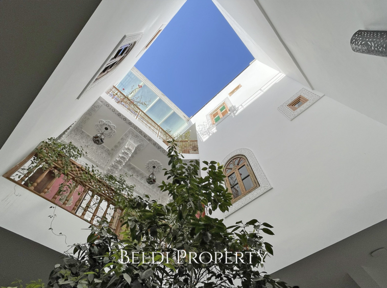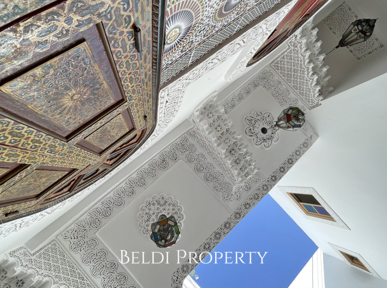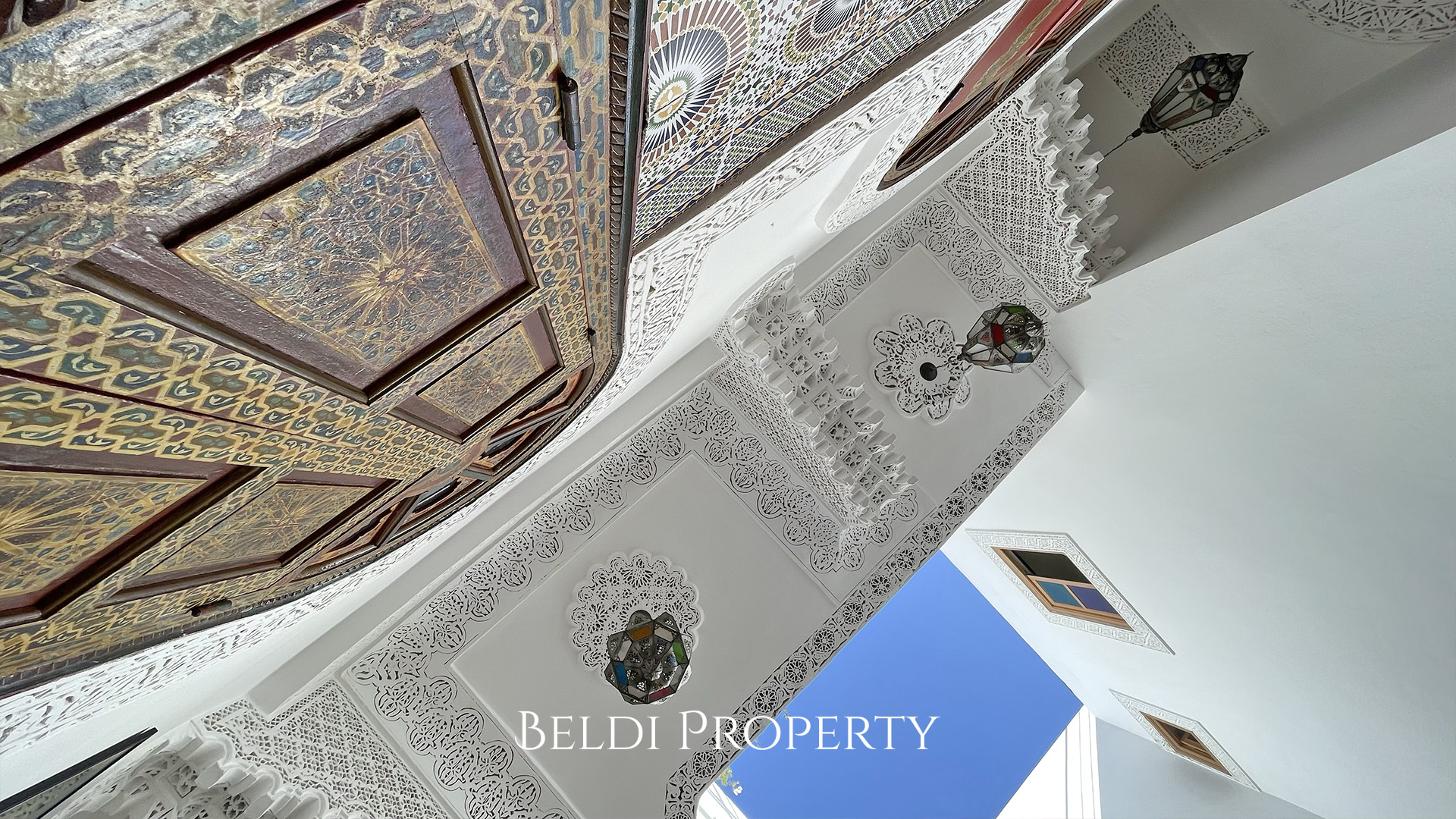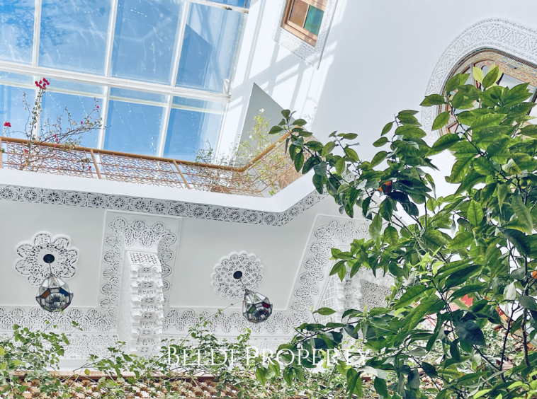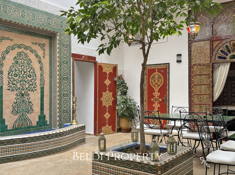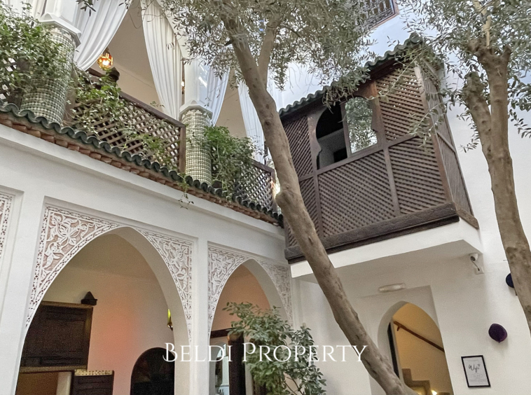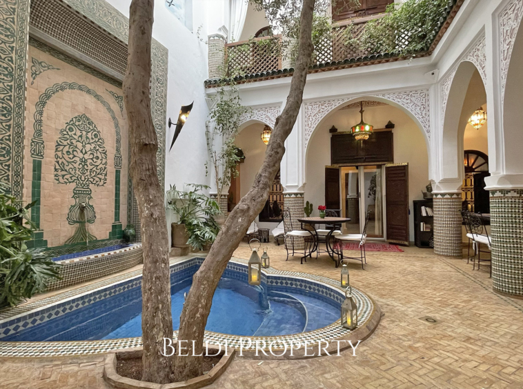 Découvrez un riad d’exception situé au cœur vibrant de la médina historique de Marrakech, dans le quartier emblématique de Mouassine. Véritable témoignage du raffinement architectural marocain et andalou, cette demeure titrée de 240 m² allie authenticité et élégance.