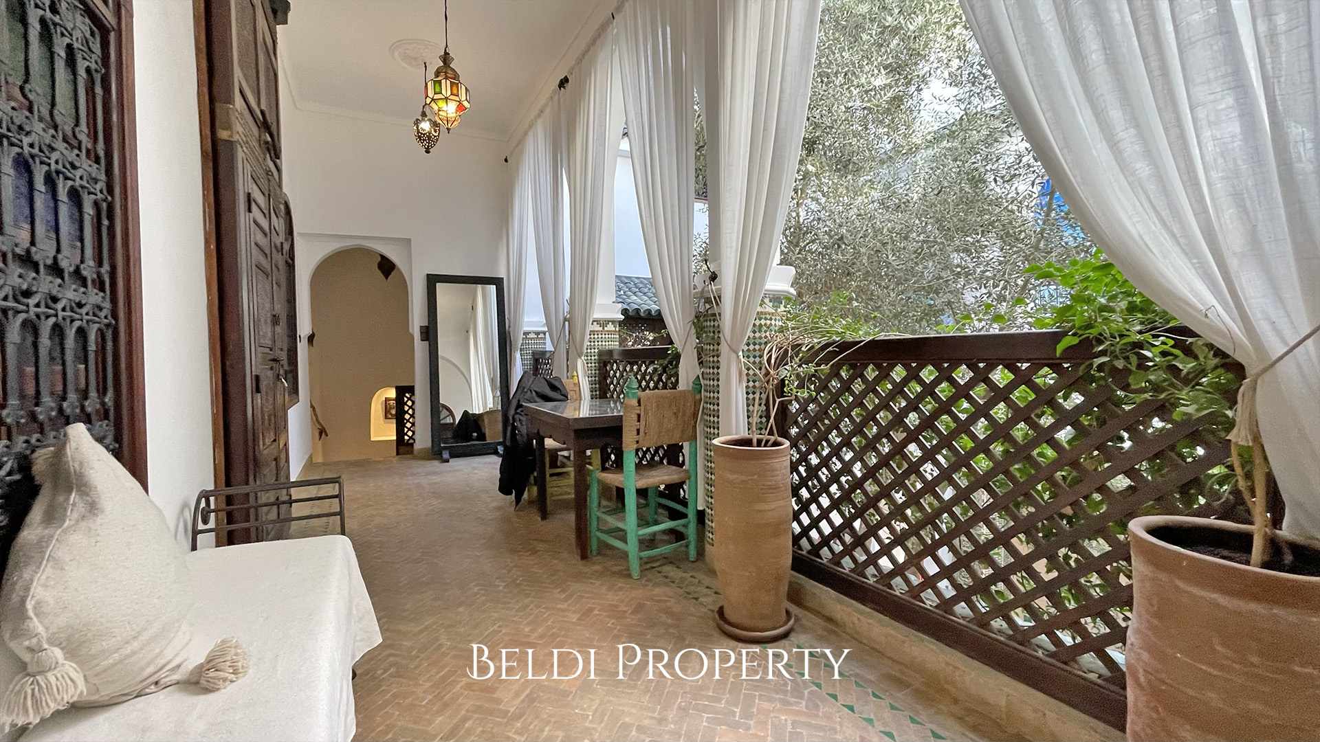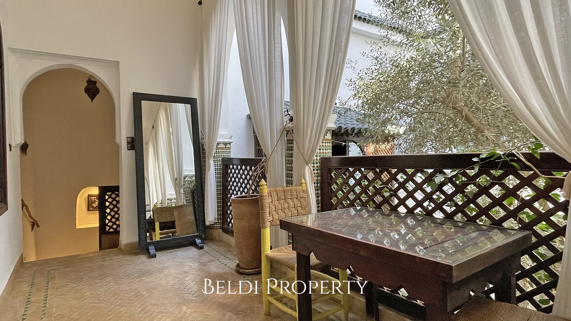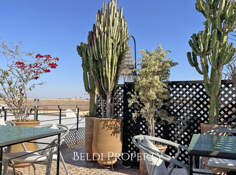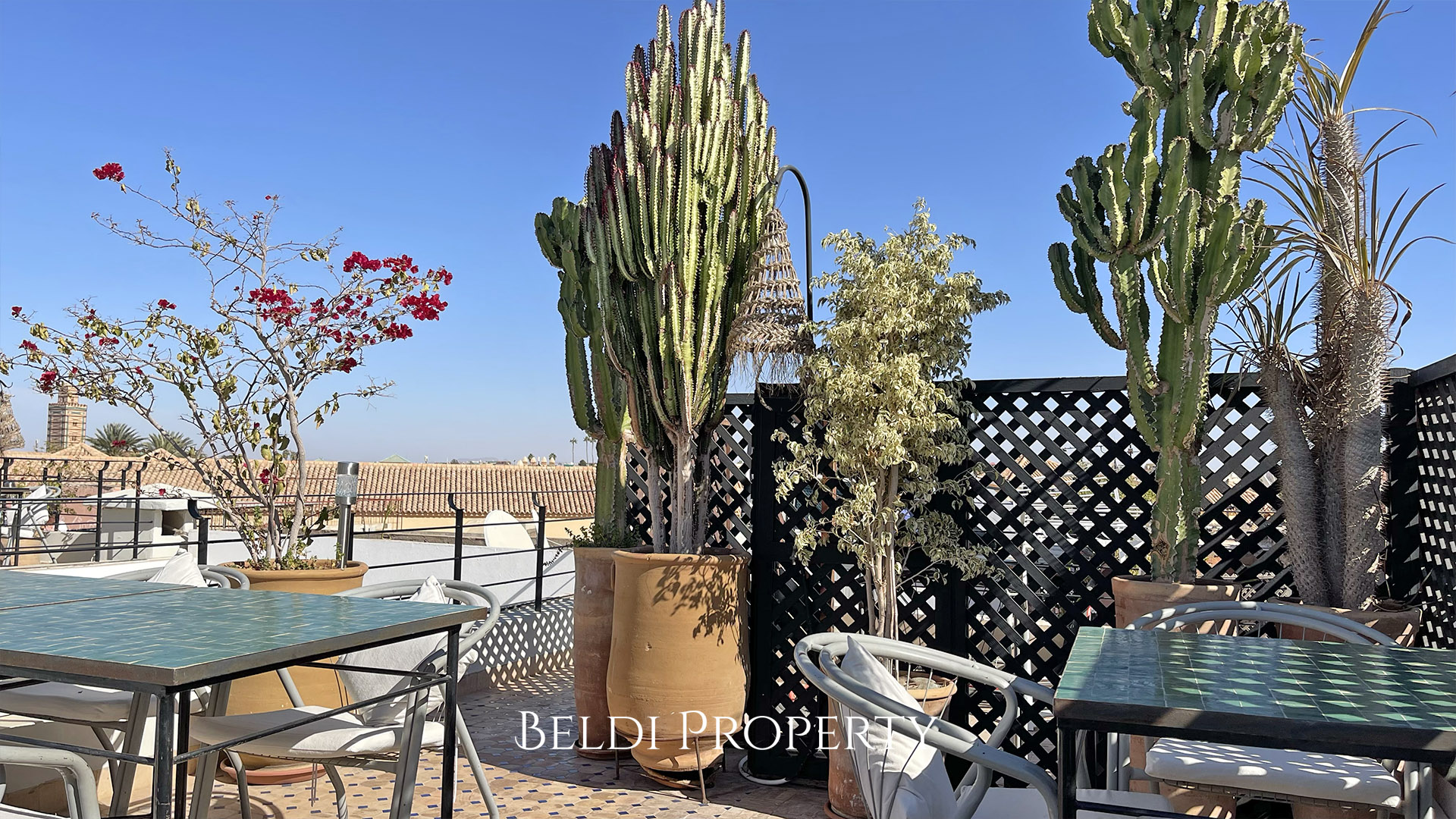 Ses plusieurs patios ombragés, agrémentés de fontaines murmurantes et d’un bassin apaisant, offrent une atmosphère envoûtante, tandis que la terrasse dévoile une vue imprenable sur les toits de la médina, capturant l’essence même de Marrakech.