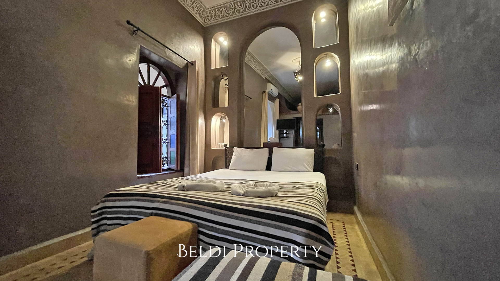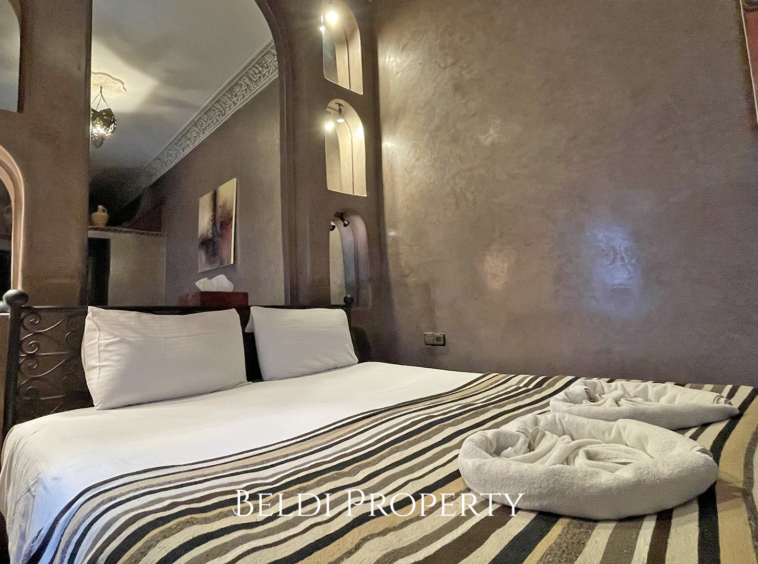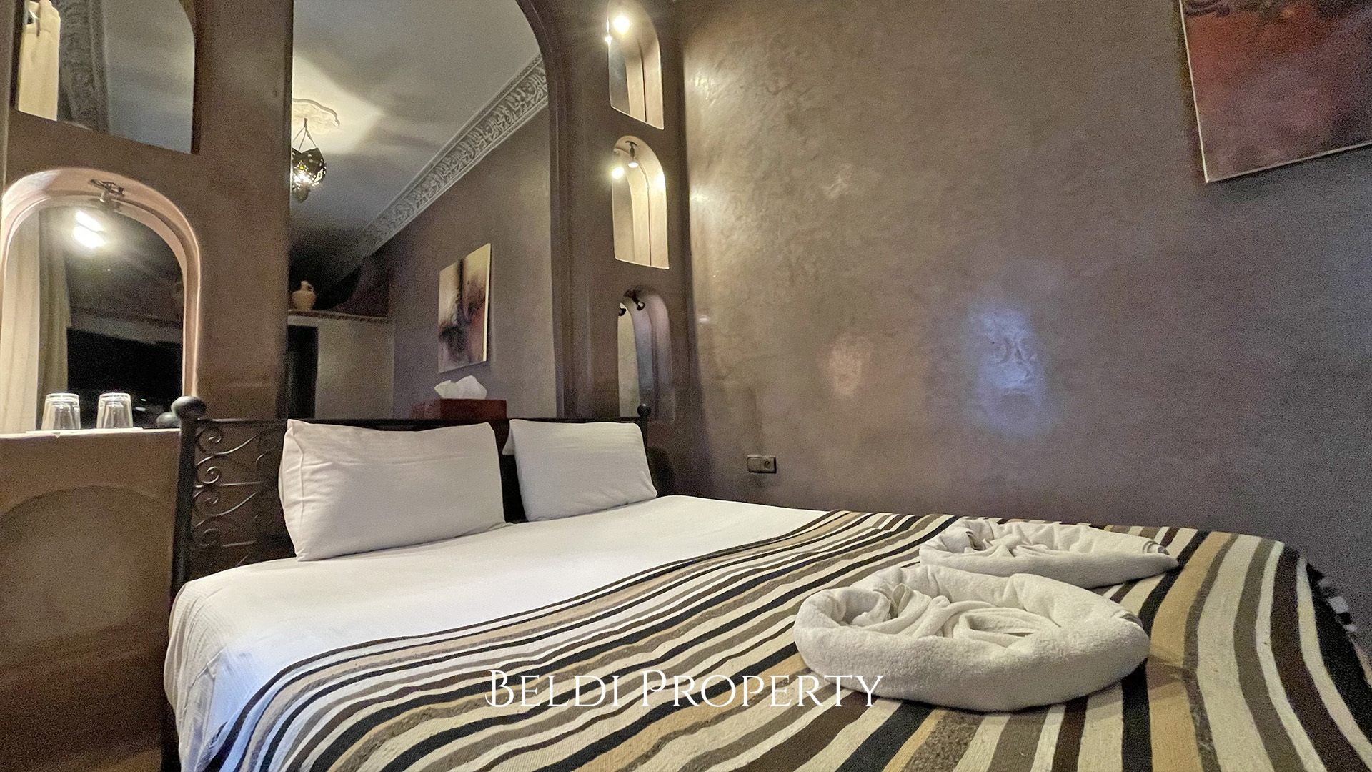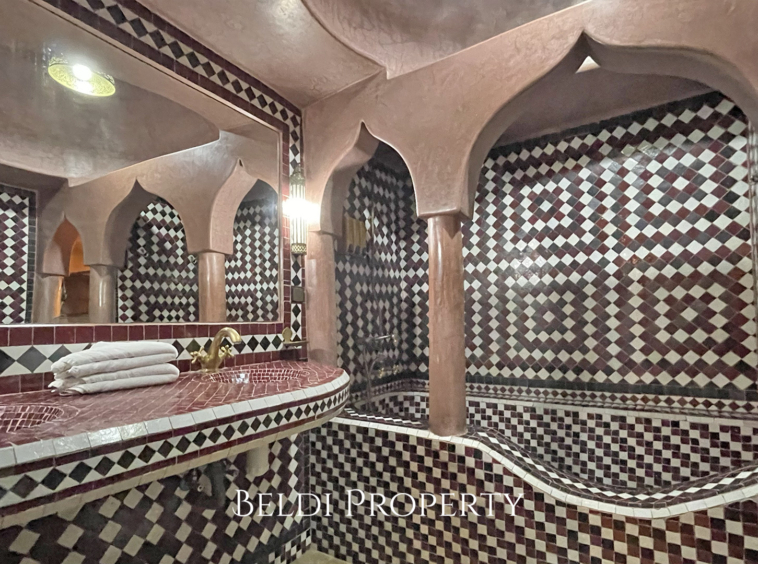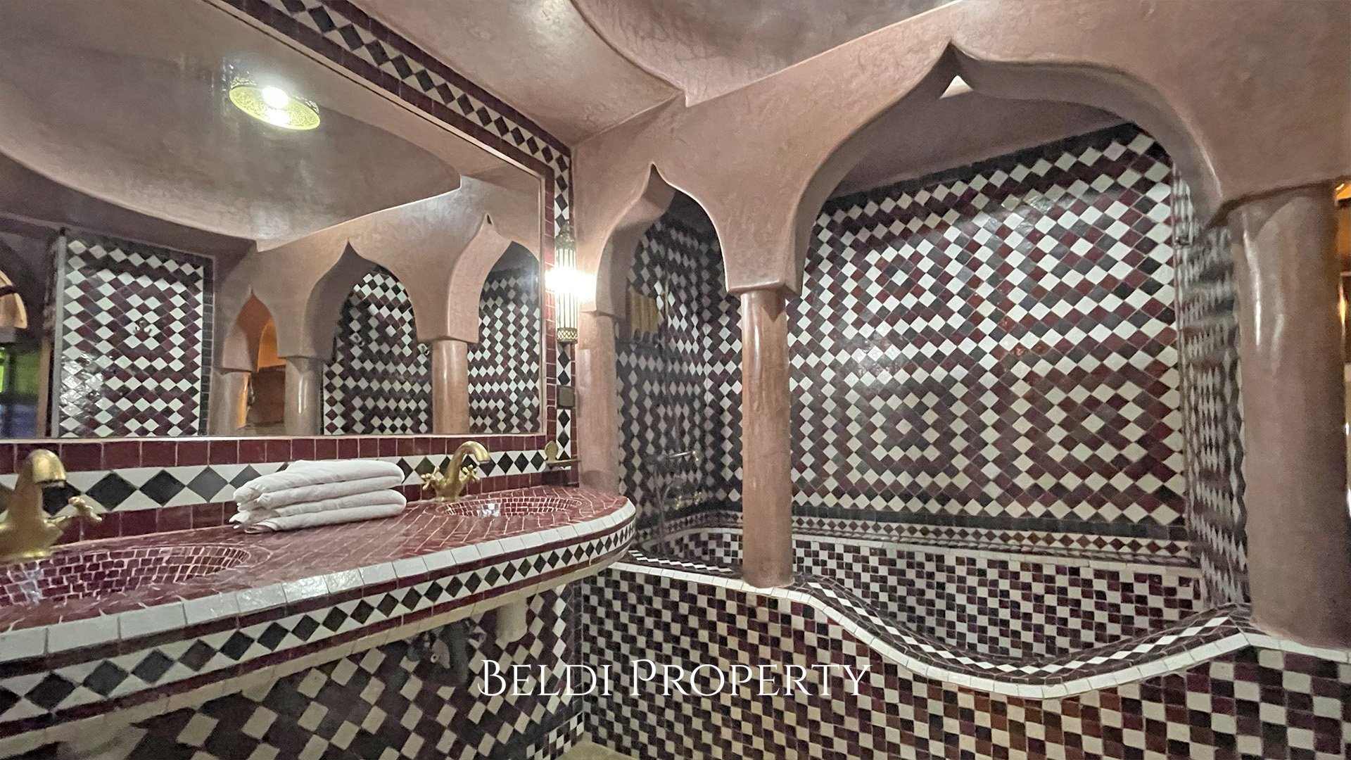 Doté de 12 chambres et suites, toutes équipées de salles de bains privatives et de climatisation réversible, ce riad est prêt pour une exploitation hôtelière immédiate. Un hammam traditionnel et une salle de massage viennent compléter ce cadre idyllique, idéal pour une expérience immersive dans la médina authentique.